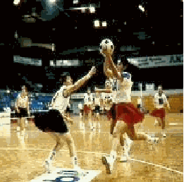 When a team scores a goal I.E. shoots the ball into the netball net, the game is restarted with a " centre pass " which is where a player throws the ball to a member of their team. Each centre pass is taken alternatively by each team. The players who take this pass are known as " centres " and when each centre pass is thrown, the other players, except for the defending centre, must be outside the centre third until the whistle is blown to start play. The netball court is divided into thirds and so whilst the game is being played, the ball must be touched in each third I.E. no player is aloud to throw the ball over a third of the court.